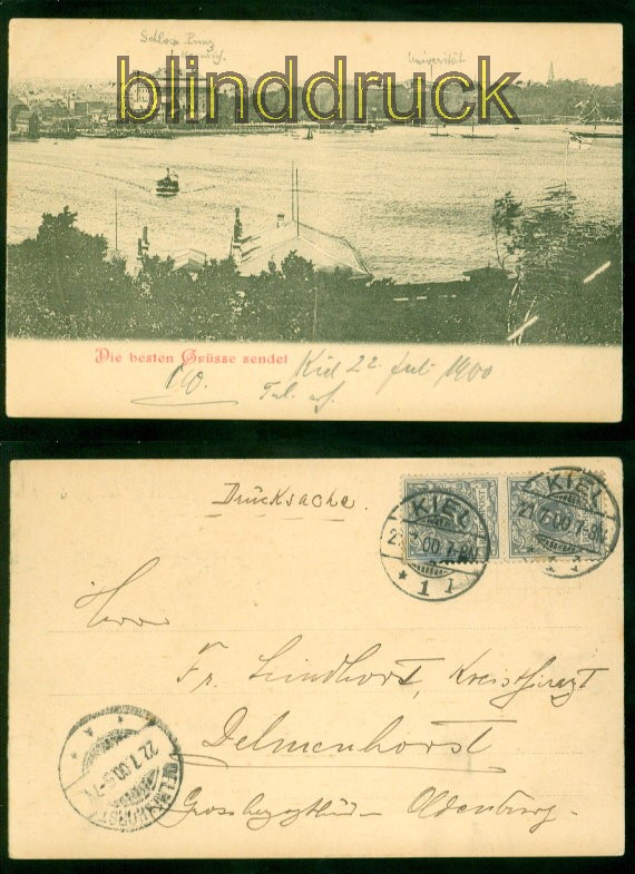 Schleswig-Holstein Kiel sw- AK Die besten Grüße sendet.... 1900 Drucksache nach Delmenhorst Karte gelaufen als Drucksachenkarte aus Kiel 21.7.1900 nach Delmenhorst Ankunftsstempel Erhaltung siehe Scan