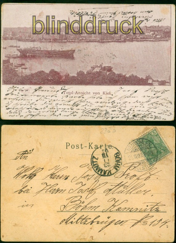 Schleswig-Holstein Kiel sw- AK Totalansicht von Kiel 1901 Neumühlen nach Böhm. Kamnitz Karte gelaufen aus Neumühlen 21.11.1901 nach Böhm. Kamnitz Ankunftsstempel Erhaltung siehe Scan