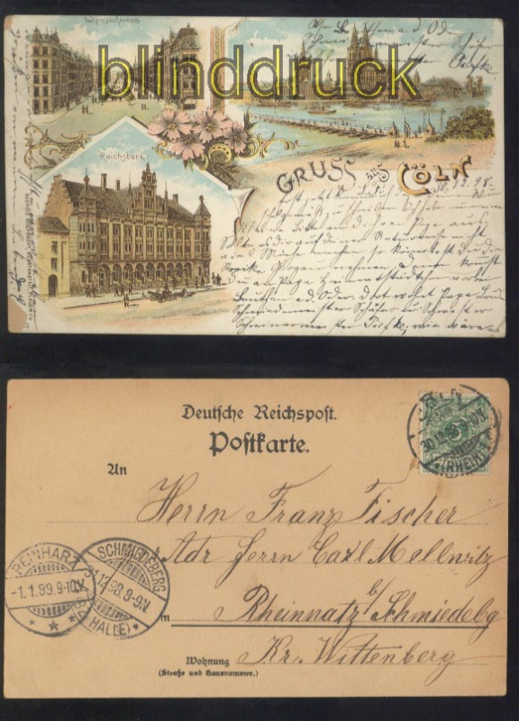 Nordrhein-Westfalen Gruss aus Köln Litho-AK drei Ansichten 1898 drei Ansichten: Hohenstaufenring, Reichsbank und Panorama mit Dom Karte gelaufen aus Köln 30.12.1898 nach Rheinnatz bei Schmiedeberg Erhaltung siehe Scan