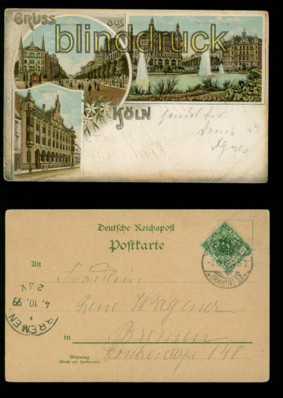 Nordrhein-Westfalen Gruss aus Köln Litho-AK drei Ansichten 1899 nach Bremen drei Ansichten: Hohenzollern-Ring, Deutscher Ring und Recihsbank Karte gelaufen aus Cöln 3.10.1899 nach Bremen Erhaltung siehe Scan