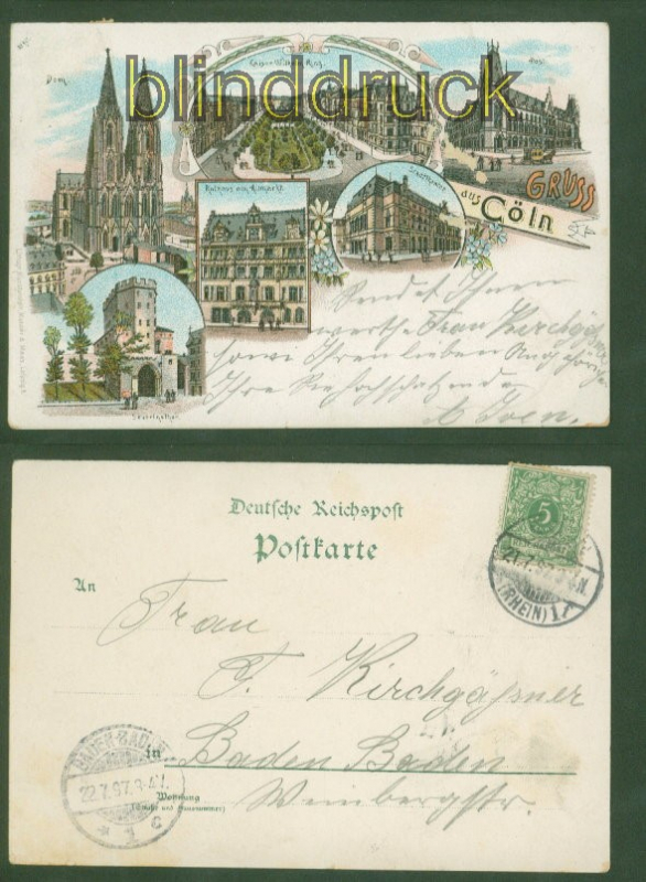 Nordrhein-Westfalen Gruss aus Köln Litho-AK sechs Ansichten 1897 nach Baden Baden sechs Ansichten: Dom, Kaiser-Wilhelm-Ring, Post, Severinsthor, Rathaus am Altmarkt und Stadttheater Karte gelaufen aus Köln 21.7.1897 nach Baden Baden Erhaltung siehe Scan