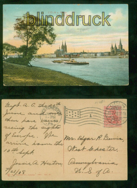 Nordrhein-Westfalen Köln a. Rhein farb-AK Partie am Rhein 1908 in die USA Karte gelaufen aus Köln 21.7.1908 in die USA Erhaltung siehe Scan