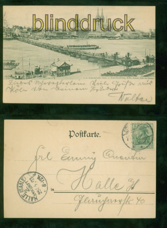 Köln sw-AK Rhein mit Brücke und Dom 1903 nach Halle/Saale (d9392)