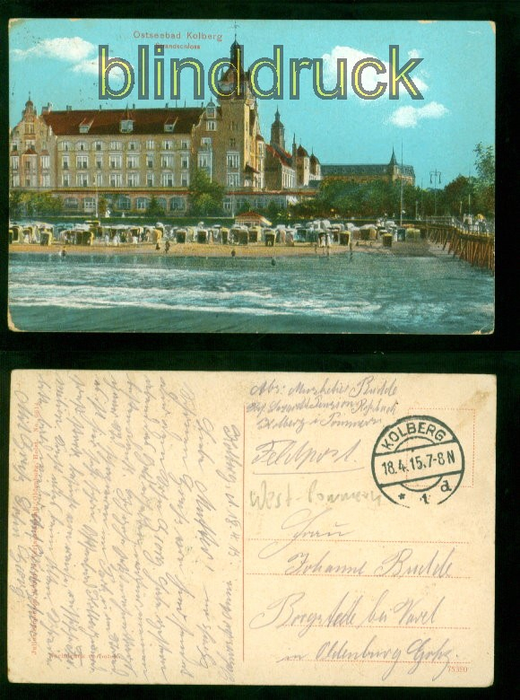 Pommern Kolberg Ostseebad farb-AK Strandschloss Feldpost 1915 nach Varel Karte gelaufen als Feldpost aus Kolberg 18.4.1915 nach Borgstede bei Varel Erhaltung siehe Scan