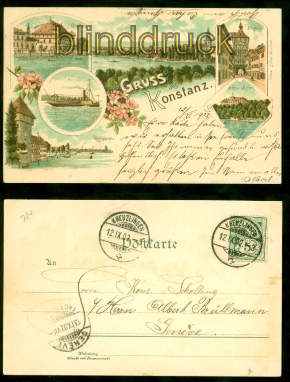 Baden-Württemberg Gruss aus Konstanz Litho-AK sechs Ansichten 1902 nach Genf sechs Ansichten Karte gelaufen aus Kreuzlingen in der Schweiz 12.9.1902 nach Genf Ankunftsstempel Erhaltung siehe Scan