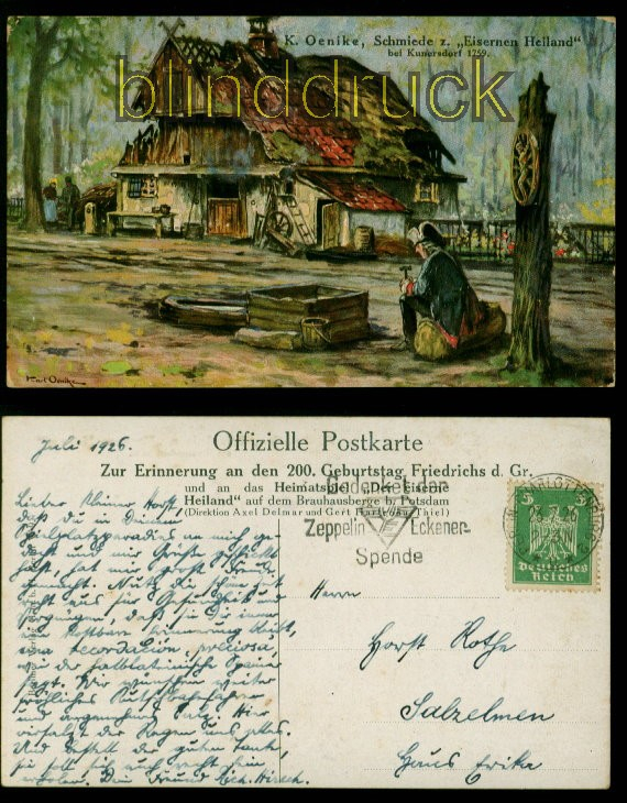 Brandenburg Kunnersdorf farb-AK Schmiede 200. Geburtstag Friedrich d. Gr. 1926 K. Oenike, Schmiede zum Eiserenen Heiland bei Kunnersdorf 1759 Zur Erinnerung an den 200. Geburtstag Friedrichs ndes Großen und an das Heimatspiel "der Eiserne Heiland" auf dem Brauhausberge bei Potsdam Karte gelaufen aus Berlin-Charlottenburg 23.7.1926 nach Salzelmen Erhaltung siehe Scan