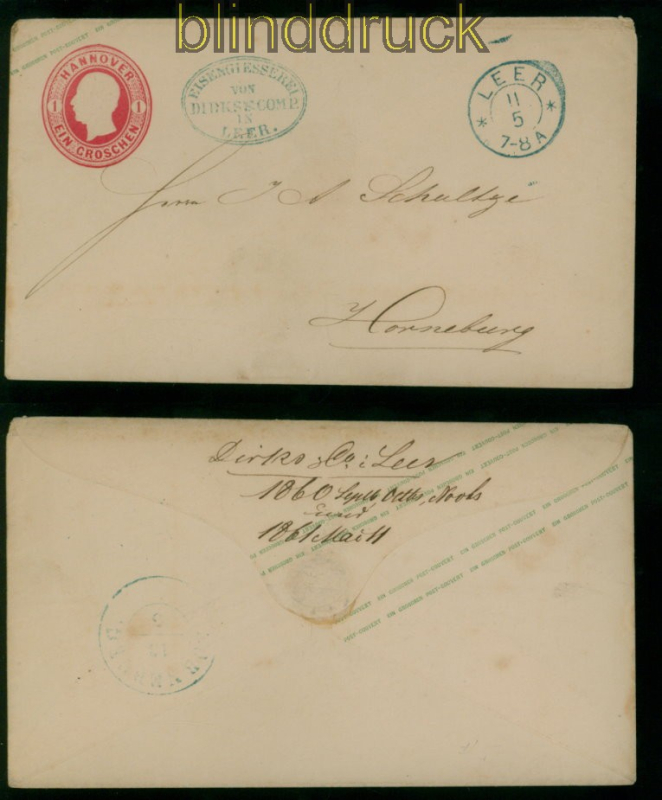 Leer GSU U 5 11.5.1861 nach Horneburg nachverwendeter Stempel Feuser # 190A ein Groschen Ganzsachenumschlag Werteindruck links kurze Gummierung nachverwendeter Altdeutschland-Stempel Leer Feuser # 190A gelaufen aus Leer 11.5.1861 nach Horneburg Ankunftsstempel Erhaltung siehe Scan