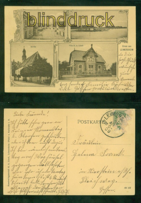 Rheinland-Pfalz Gruss aus Leimersheim sw-AK vier Ansichten 1909 vier Ansichten: Strassenpartie, Rheinüberfahrt, Kirche und Villya K. A. Lösch Karte gelaufen aus Leimersheim 18.8.1909 Marke beschädigt Erhaltung siehe Scan