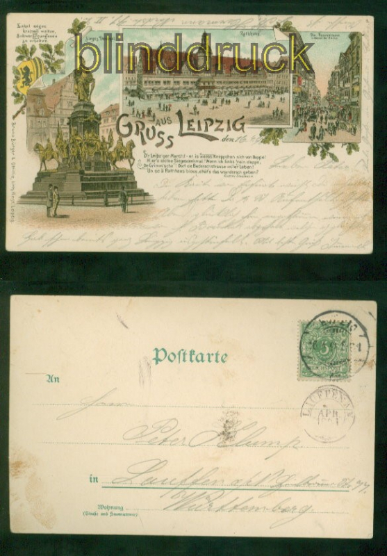 Sachsen Gruss aus Leipzig Litho-AK drei Ansichten 1898 nach Lauffen drei Ansichten: Siegesdenkmal, Rathaus und Petersstrasse während der Messe Karte gelaufen aus Leipzig 16.4.1898 nach Lauffen Ankunftsstempel Erhaltung siehe Scan