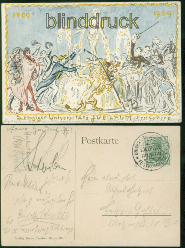 Sachsen Leipzig farb-AK Leipziger Universitäts-Jubiläum Festkomers 1409-1909 SSt. nach Leipzig mit Sonderstempel SSt. Universitäts-Jubiläum Leipzig 30.7.1909 Festkomers Seltener Stempel Bochmann # S 17 Karte gelaufen als Ortspostkarte Leipzig Erhaltung siehe Scan