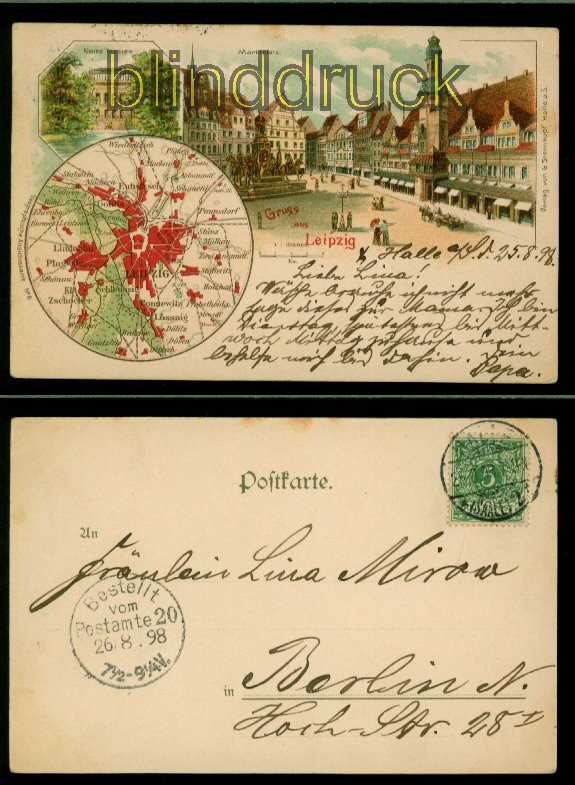 Sachsen Gruss aus Leipzig farb-Litho-AK drei Ansichten 1898 nach Berlin 3 Ansichten: Neues Theater, Marktpülatz und Landkarte Karte gelaufen aus Halle / Saale 25.8.1898 nach Berlin Erhaltung siehe Scan