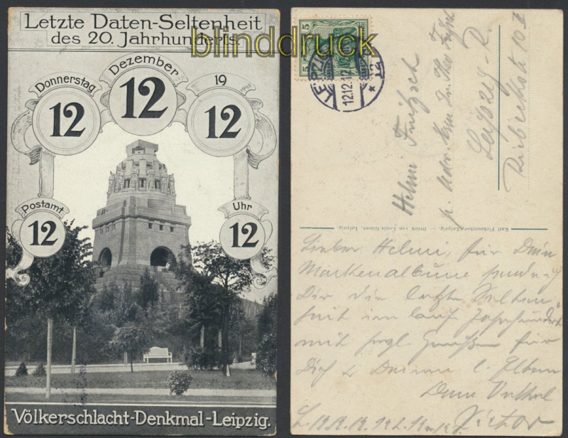 Sachsen Leipzig sw-AK 12.12.12 Völkerschlacht Denkmal Letzte Daten-Seltenheit des 20. Jahrhunderts Donnerstag 12. 12. Dewzmber 1912 Postamt 12