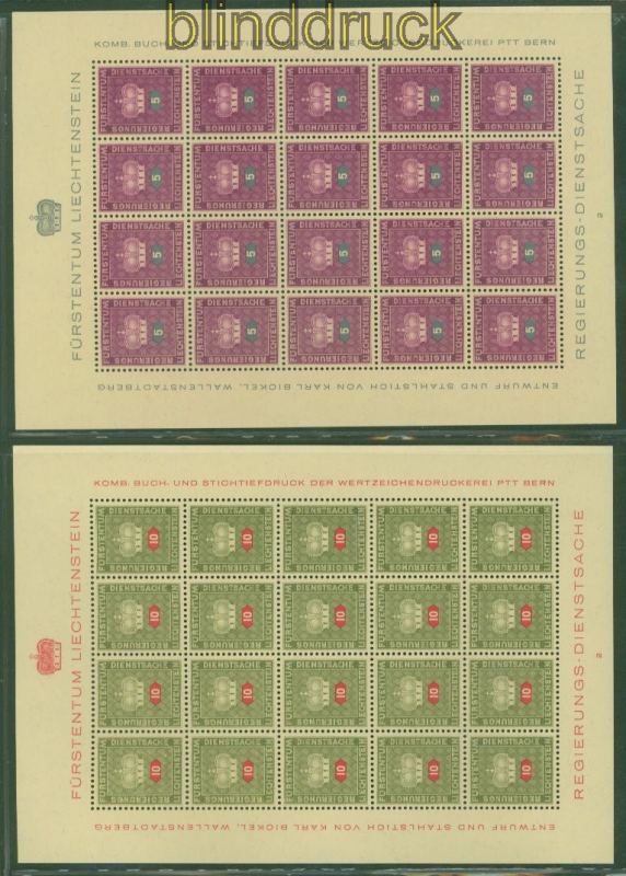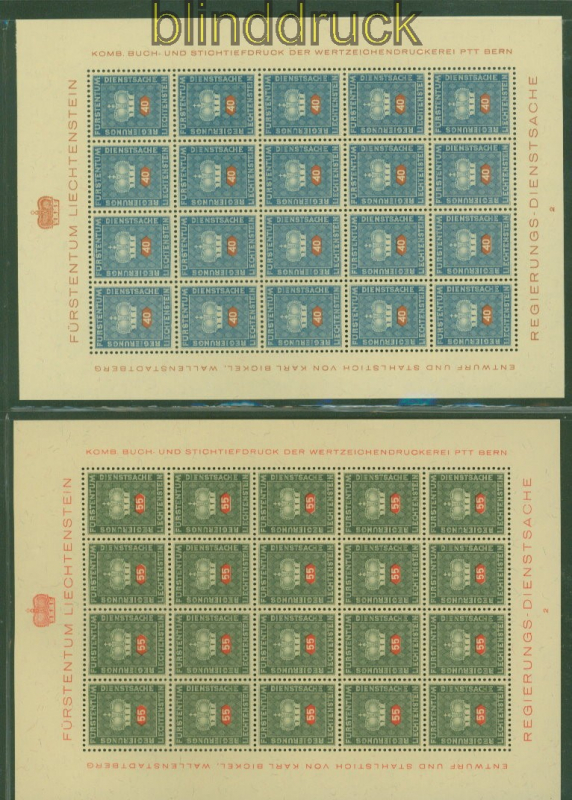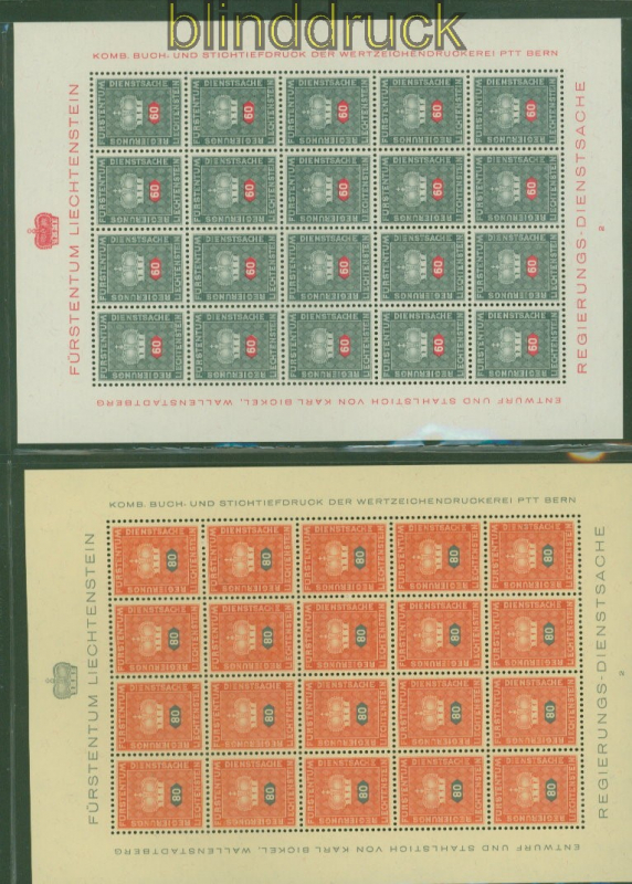 Liechtenstein Dienst Mi # 35/44 und 56 und 59 postfrisch in kompletten Bögen Dienstmarken komplette Ausgabe im Bogen dazu zwei Bögen aus der nachfolgenden Ausgabe nicht gefaltet hoher Katalogwert postfrisch Erhaltung siehe Scan