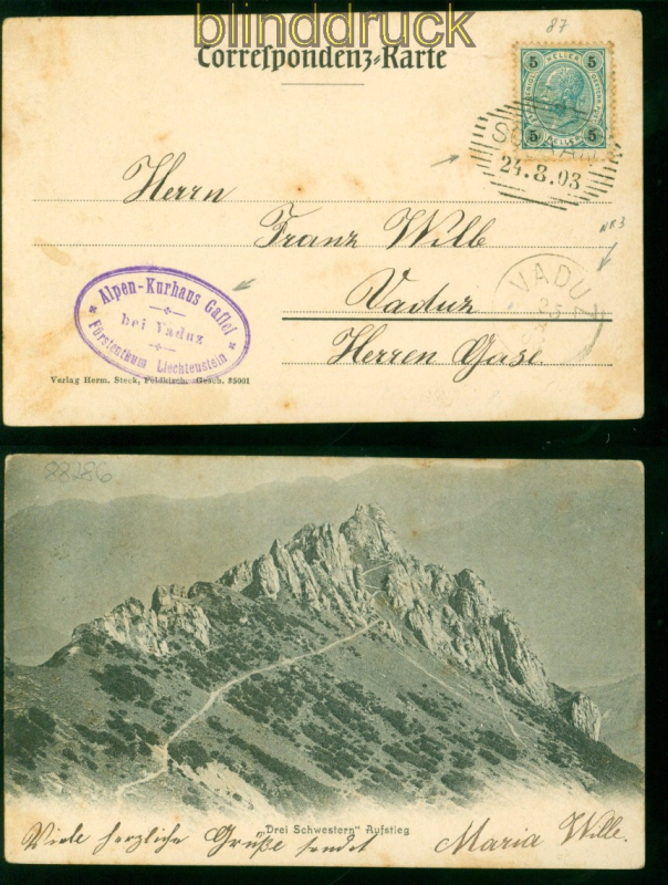 Liechtenstein Vorläufer Mi # 87 EF auf AK aus Schaan 24.8.1903 nach Vaduz 5 Heller blaugrün aus Österreich als Vorläufermarke portogerechte Einzelfrankatur auf Ansichtskarte Motiv: Drei Schwestern Aufstieg gelaufen aus Schaan 24.8.1903 nach Vaduz Ankunftsstempel Erhaltung siehe Scan