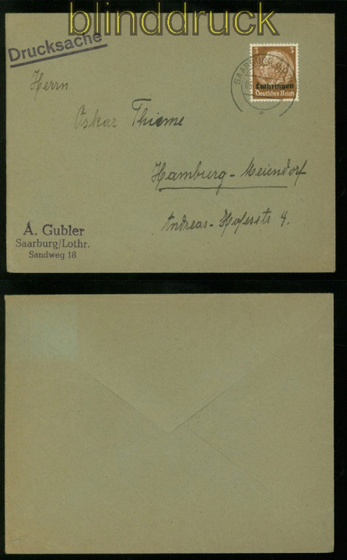 Deutsches Reich Besetzungsausgaben 2.Weltkrieg Lothringen Mi # 1 EF auf Drucksache Saarburg 1941 3 Pfg. Aufdruckmarke Hindenburg als Einzelfrankatur EF auf Drucksache aus Saarburg 5.7.1941 nach Hamburg Erhaltung siehe Scan