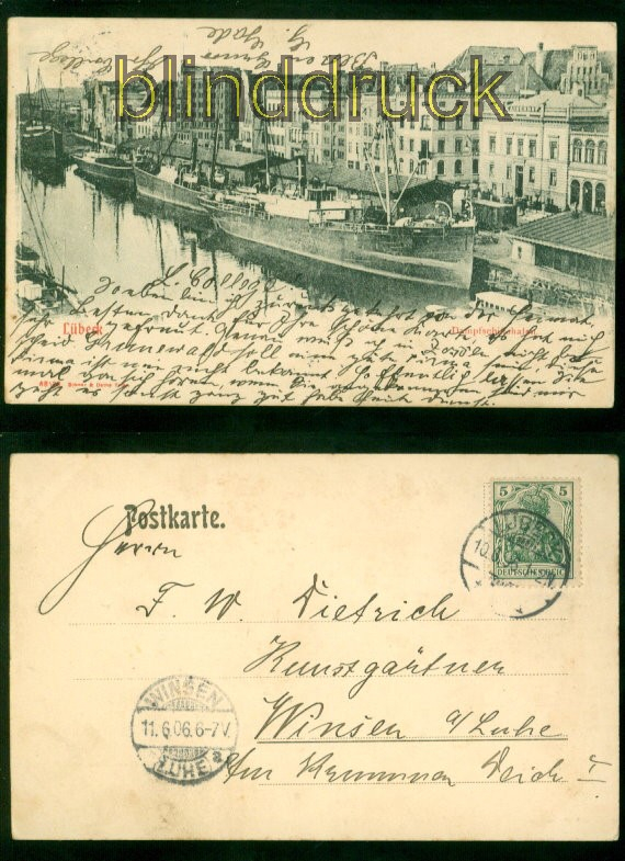 Schleswig-Holstein Lübeck sw-AK Dampfschiffshafen 1906 nach Winsen an der Luhe Karte gelaufen aus Lübeck 10.6.1906 nach Winsen an der Luhe Ankunftsstempel Erhaltung siehe Scan