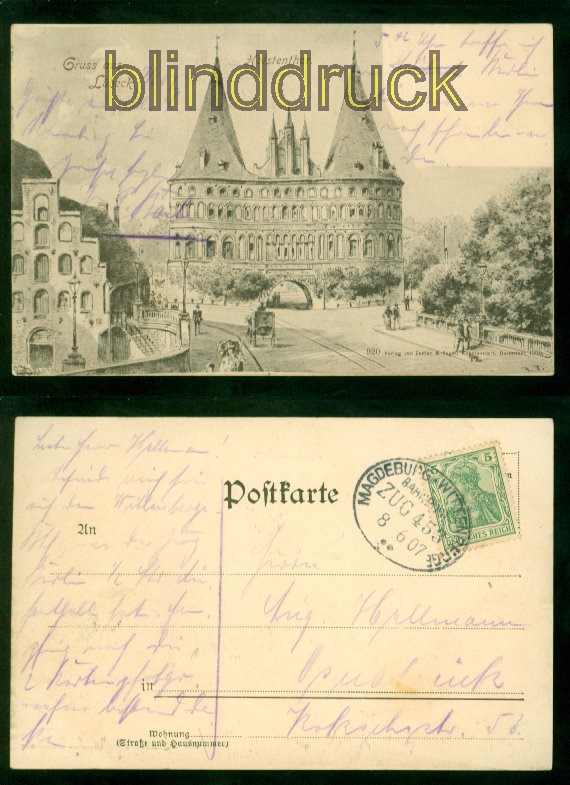 Schleswig-Holstein Gruss aus Lübeck sw-AK Holstentor Bahnpost 1907 nach Osnabrück Karte gelaufen mit Bahnpost Magdeburg - Wittenberge Zug 453 8.6.1907 nach Osnabrück Erhaltung siehe Scan