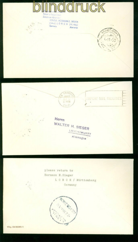 Lufthansa drei Erstflug-Belege aus 1958 und 1960 drei Lufthansa-Erstflugbeleg der Firma Sieger Eröffnungsflug Kairo LH 604/605 3.11.1958 Paris - San Francisco 13.5.1960 Eröffnungsflug Dhahran LH 646/647 gute Erhaltung siehe Scan