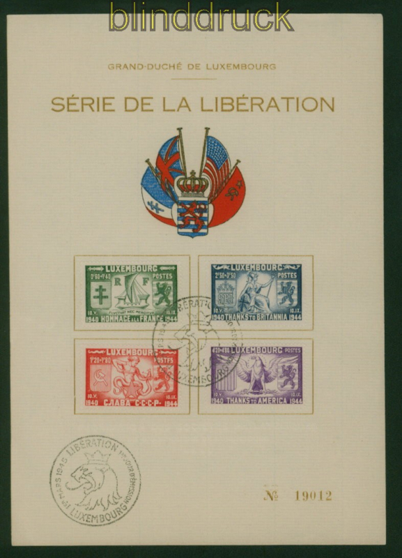 Luxemburg Mi # 343/46 FDC Sonderstempel auf Gedenkblatt Befreiung Luxemburg komplette Ausgabe mit Ersttagsstempel auf großformatigen Gedenkblatt FDC Erhaltung siehe Scan
