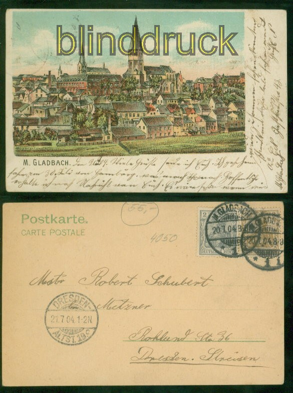 Nordrhein-Westfalen Mönchen-Gladbach farb-AK Teilansicht 1904 nach Dresden Karte gelaufen aus M.-Gladbach 20.7.1904 nach Dresden Ankunftsstempel Erhaltung siehe Scan