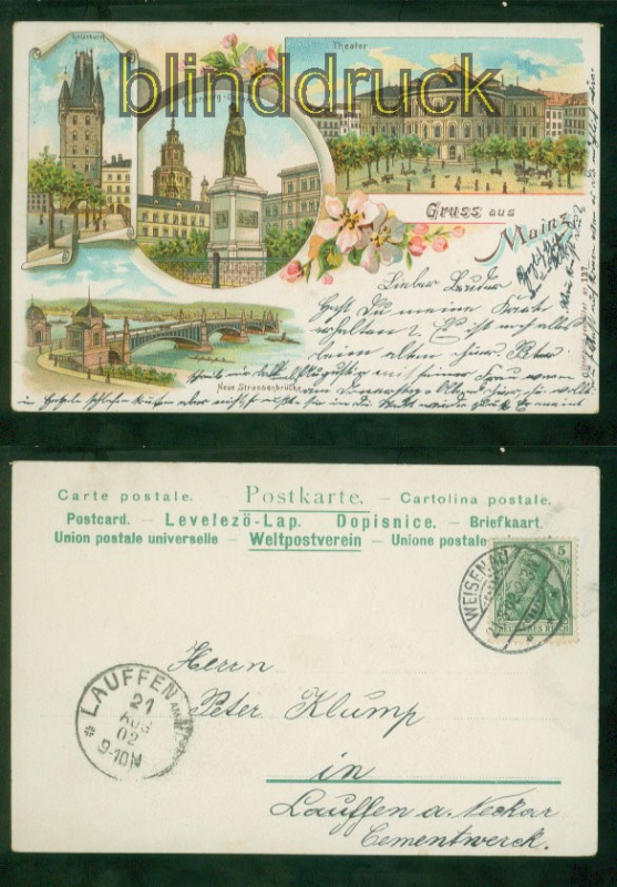 Rheinland-Pfalz Gruss aus Mainz Litho-AK vier Ansichten 1902 nach Lauffen vier Ansichten: Holzthurm, Gutenberg-Denkmal, Theater und neue Strassenbrücke Karte gelaufen aus Wiesenau 21.8.1902 nach Lauffen Ankunftsstempel Erhaltung siehe Scan