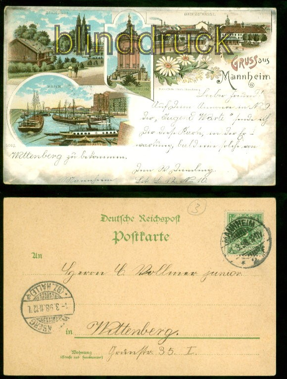 Baden-Württemberg Gruss aus Mannheim Litho-AK vier Ansichten 1898 nach Wittenberg vier Ansichten: Stadtpark, Wasserthurm, Hafen und Breitestrasse Karte gelaufen aus Mannheim 1.3.1898 nach Wittenberg Erhaltung siehe Scan