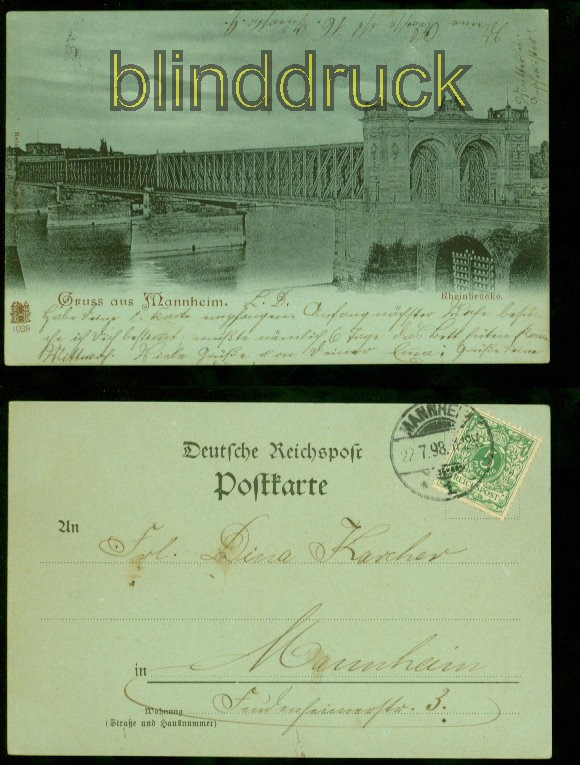 Baden-Württemberg Mannheim Mondschein-AK Rheinbrücke 1898 Ortspostkarte Karte gelaufen als Ortspostkarte Mannheim 22.7.1898 Erhaltung siehe Scan