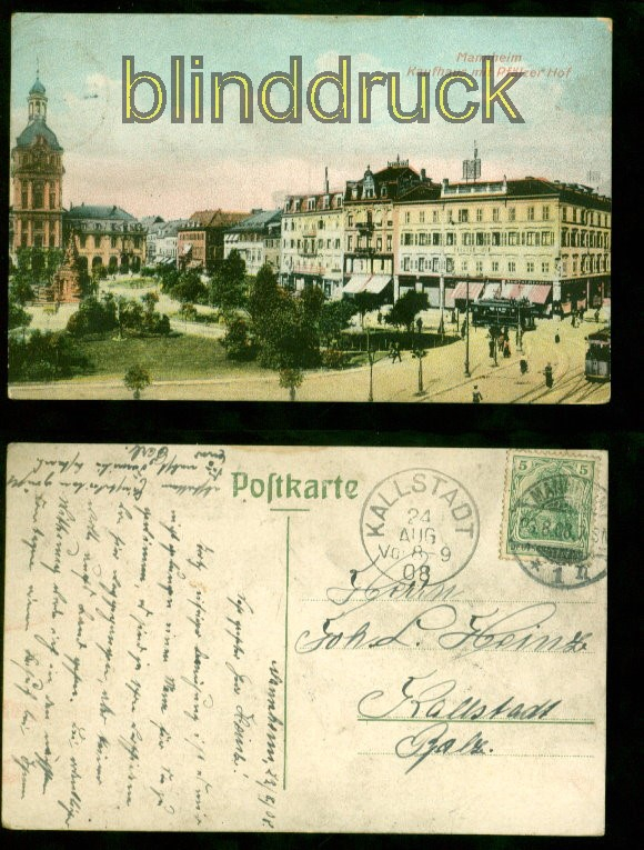 Baden-Württemberg Mannheim farb-AK Kaufhaus mit Pfälzer Hof 1908 nach Kallstadt Karte gelaufen aus Mannheim 23.8.1908 nach Kallstadt Ankunftsstempel Erhaltung siehe Scan