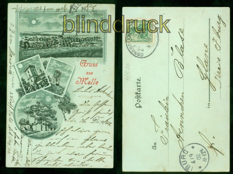 Niedersachsen Gruss aus Melle Mondschein-AK vier Ansichten 1902 nach Iburg vier Ansichten: Totalansicht, Dietrichsburg, Otto´s Höhe und alter Mailer Linden Karte gelaufen mit Bahnpost Osnabrück Zug 522 4.9.1902 nach Iburg Erhaltung siehe Scan