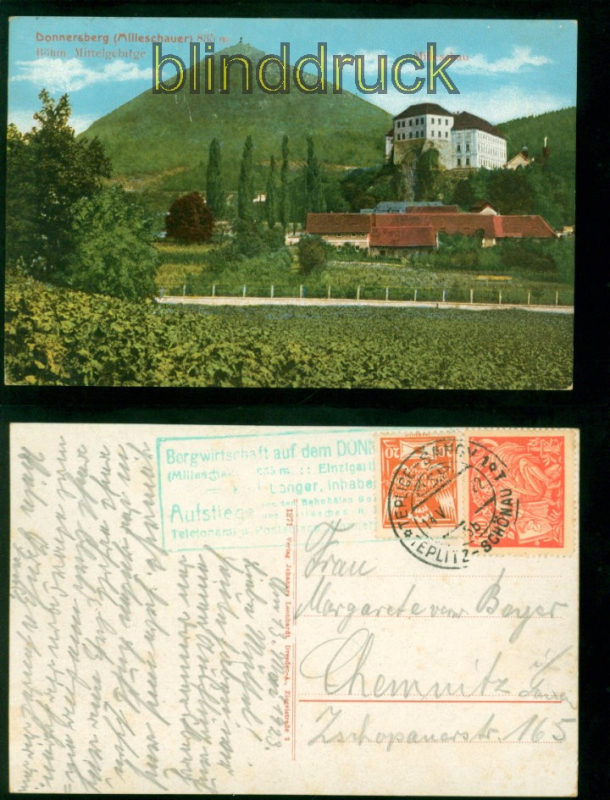 Böhmen Milleschau farb-AK Donnersberg (Milleschauer) Teplitz-Schönau 1923 nach Chemnitz Karte gelaufen aus Teplitz-Schönau 15.5.1923 nach Chemnitz mit grünem Firmenstempel Bergwirtschaft auf dem Donnerberg Erhaltung siehe Scan