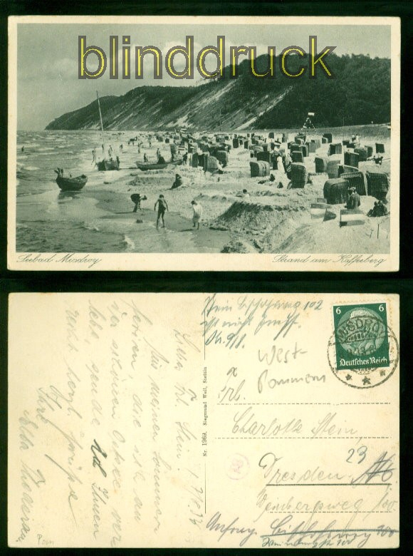 Misdroy Seebad sw-AK Strand am Kaffeeberg 1933 nach Dresden (d9819)