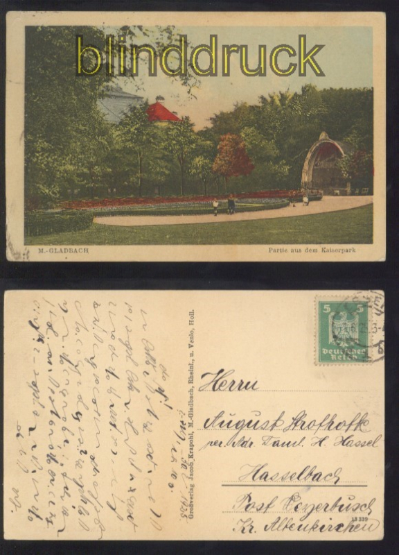 Nordrhein-Westfalen Mönchen-Gladbach farb-AK Partie aus dem Kaiserpark 1925 Karte gelaufen aus Mönchen-Gladbach 1.6.1925 nach Hasselbach Erhaltung siehe Scan