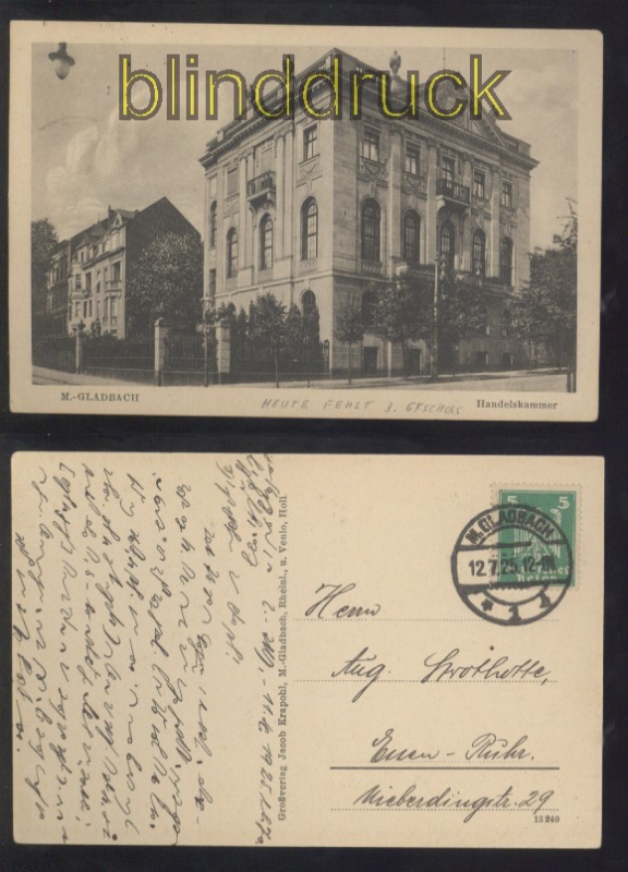 Nordrhein-Westfalen Mönchen-Gladbach sw-AK Handelskammer 1925 Karte gelaufen aus Mönchen-Gladbach 12.7.1925 nach Essen Ruhr Erhaltung siehe Scan