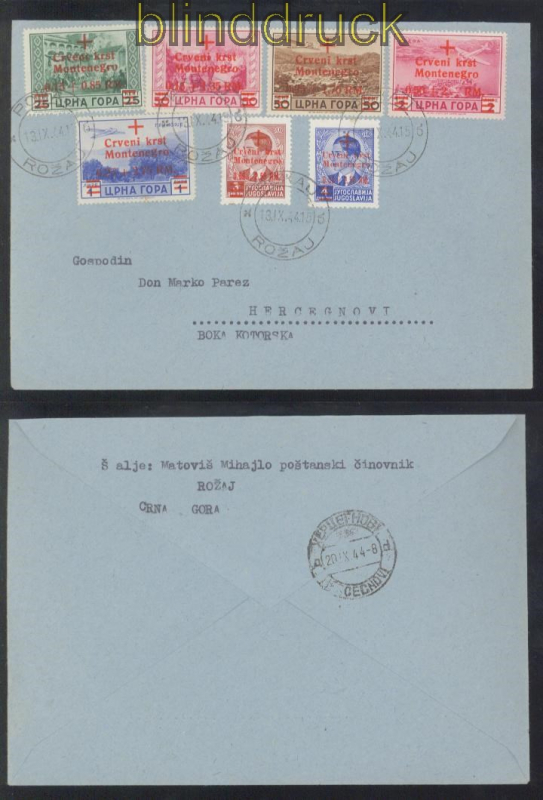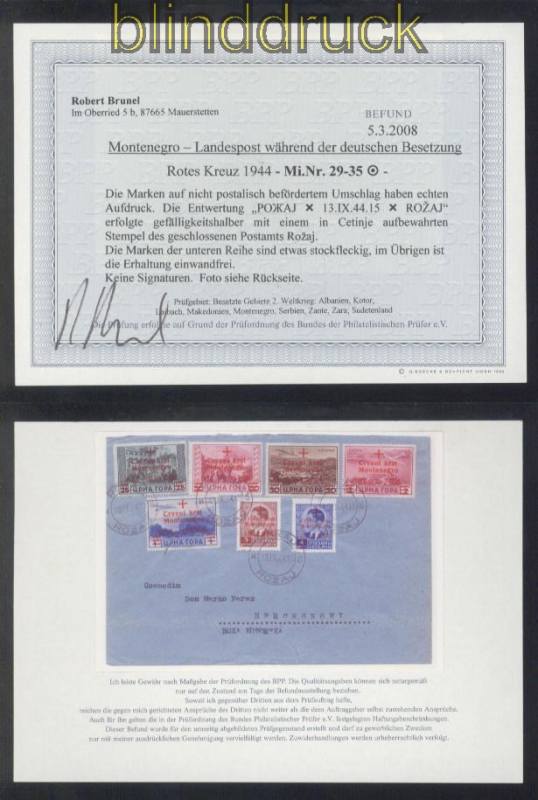 Deutsches Reich Besetzungsausgaben 2.Weltkrieg Montenegro Mi # 29/35 auf Satz-Brief Rozaj Fotobefund Brunel BPP Rotes Kreus 1944 Satz-Brief mit dem Gefälligkeitsstempel Rozay entwertet Fotobefund Brunel BPP: ".... die Marken der untereen Reihe sind etwas fleckig, sonst einwandfrei" Erhaltung siehe Scan