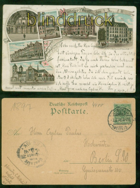 Nordrhein-Westfalen Münster i. Westf. Litho-AK sechs Ansichten 1897 nach Berlin sechs Ansichten: Rathaus-Saal, Königl. Akademie, Königl. Residenz, Hotel u. Restaurant Kaiserhof, Prinzipalmarkt und der hohe Dom Karte gelaufen aus Münster 3.3.1897 nach Berlin Stempeldurchschlag vom Ankunftsstempel Erhaltung siehe Scan