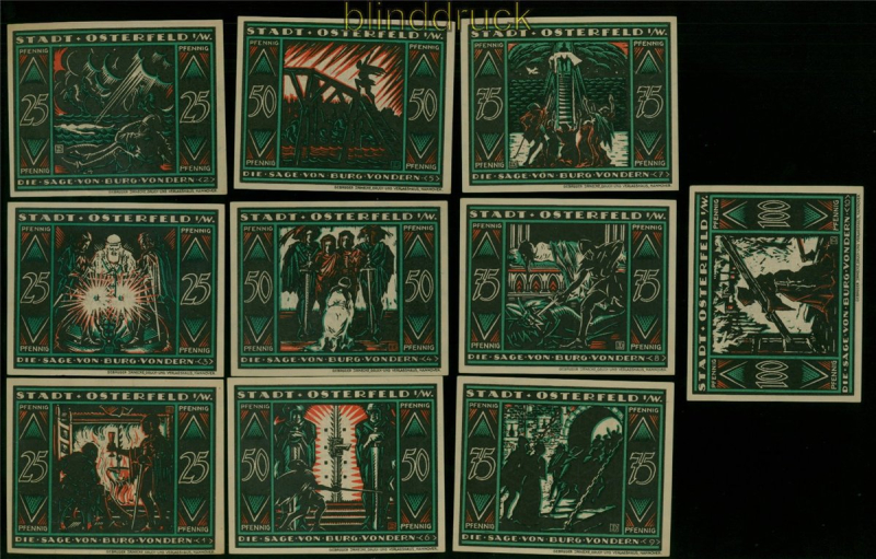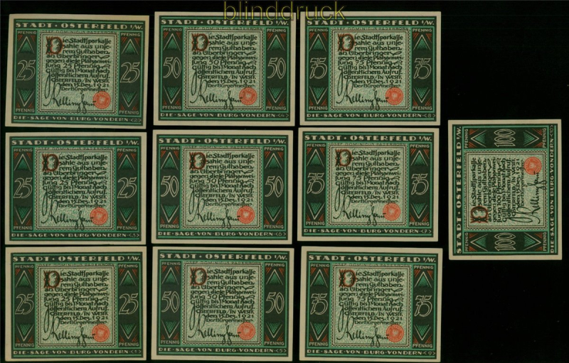 Osterfeld i. W. Notgeld 10 verschiedene Notgeldscheine 1921 zehn verschiedene Notgeldscheine der Stadt Osterfeld in Westfalen je drei Notgeldscheine zu je 25, 50 und 75 Pfennig sowie einnmal 100 Pfennig alles verschiedene Motive Gutscheine der Stadtsparkasse Osterfeld aus der Zeit der Inflation 1921 Erhaltung siehe Scan