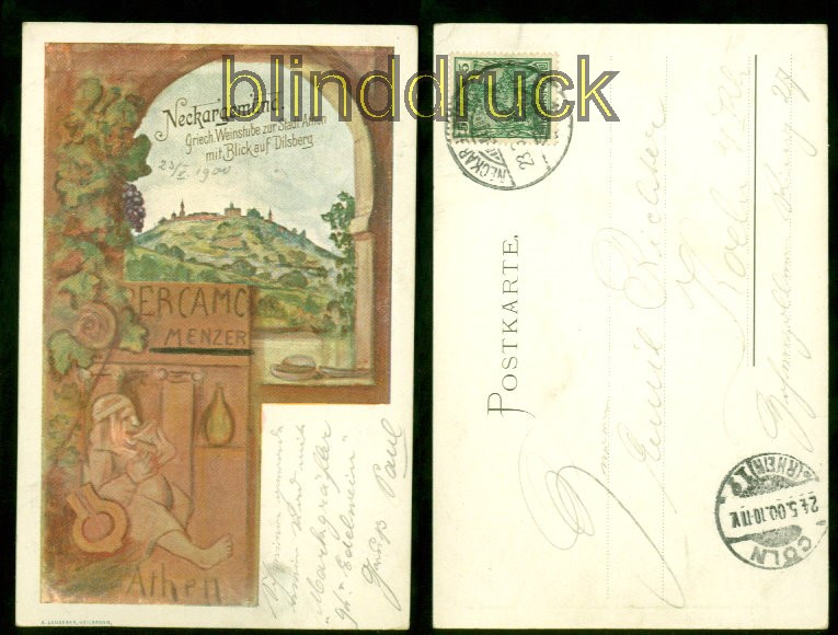 Baden-Württemberg Neckargemünd farb-AK Griech. Weinstube zur Stadt Athen 1900 nach Köln mit Blick auf Dilsberg Karte gelaufen aus Neckargemünd 23-5-1900 nach Köln Ankunftsstempel Erhaltung siehe Scan