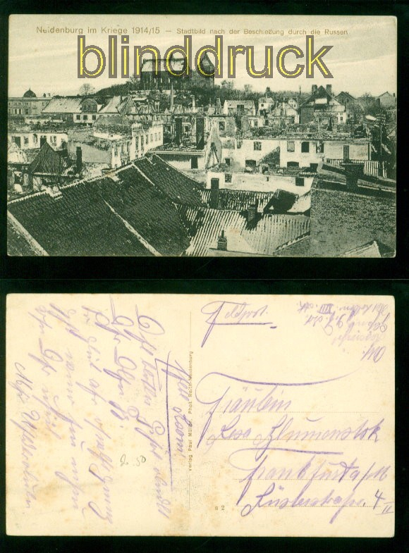 Ostpreussen Neidenburg sw-AK im Kriege 1914/15 Stadtbild nach der Beschießung durch die Russen Feldpost Karte gelaufen als Feldpostkarte nach Frankfurt / Main Erhaltung siehe Scan
