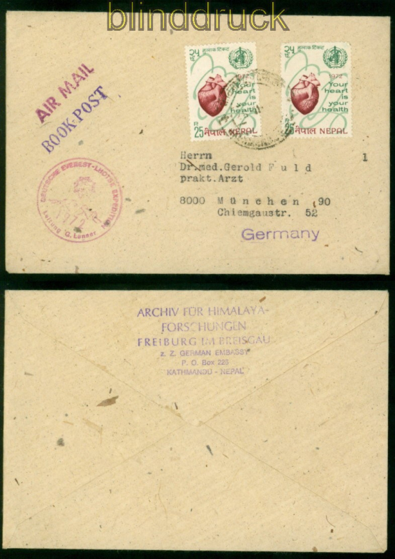 Nepal Deutsche Eversest-Lhotse Expeditionen 1972 nach München Book-Post Airmail Absender: Archiv für Himalaya-Forschungen Freiburg Deutsche Botschaft Kathmandu gelaufen nach München Erhaltung siehe Scan