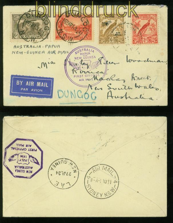 Neu Guinea Mi # 85 und 67 MiF mit Australien # 112 und 120 LuPo-Brief 1934 schöne Mischfrankatur aus Neu Guinea und Australien auf Luftpostbrief als Erstflugbeleg Juli 1934 Brief mit Inhalt diverse Stempel Erhaltung siehe Scan