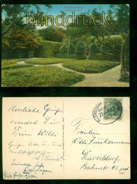 Niedersachsen Neuenburg farb-AK Jacobs Garten Bahnpost 1916 nach Düsseldorf Karte gelaufen mit Bahnpost Ellenserdamm - Neuenburg Zug 621 30.5.1916 nach Düsseldorf Erhaltung siehe Scan