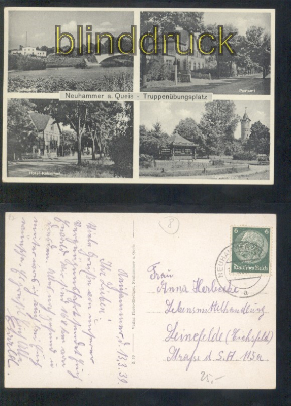 Schlesien Neuhammer a. Queis sw-AK Truppenübungsplatz vier Ansichten 1939 Truppenübungsplatz vier Ansichten: Dorfpartie, Postamt, Hotel Kaiserhof und Lagereingang Karte gelaufen aus Neuhammer 14.3.1939 nach Leinefeld Erhaltung siehe Scan