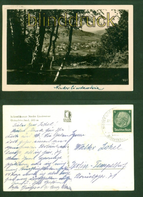 Sudetenland Nieder Lindewiese sw-AK Schrothkurort Gesamtansicht ca. 1936 nach Berlin Karte gelaufen aus Nieder-Lindewiese ca. 1936 nach Berlin Erhaltung siehe Scan