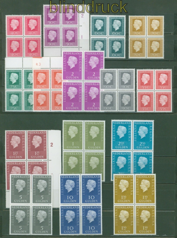 Niederlande Mi # 911, 914, 922, 944/45, 956, 976, 978/82, 1005, 14047 und 1064 postfrische 4er-Blöcke Königin Juliane (Regina) komplette Ausgabe in 4er-Blöcken postfrisch Mi # 1005 mit Einriß Erhaltung siehe Scan