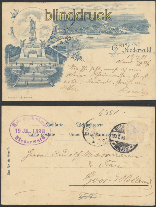 Hessen Niederwald Rüdesheim sw-AK Gruss vom Niederwalddenkmal 1898 Karte gelaufen aus Rüdesheim 20.7.1898 nach Goor in Holland Marke entfernt Erhaltung siehe Scan