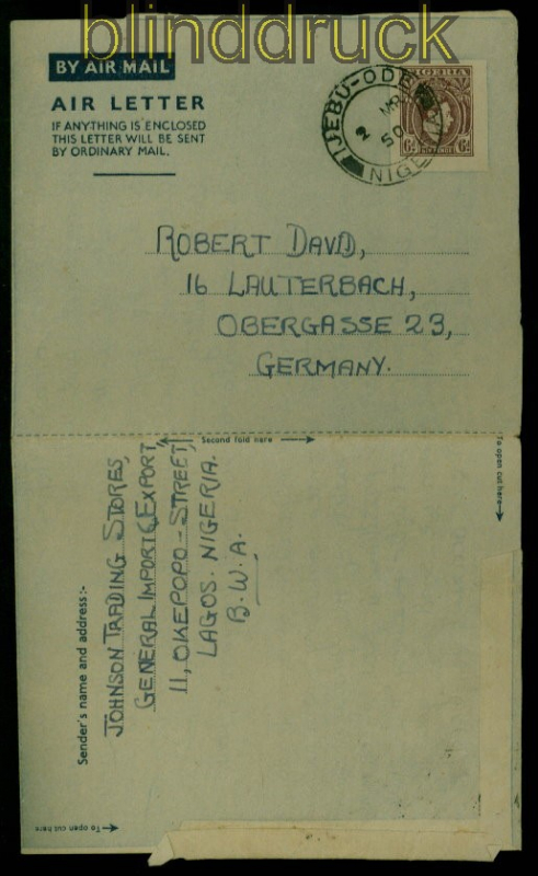 Nigeria Luftpostleichtbrief aus Lagos 1950 nach Lauterbach 6 Pence Luftpostleichtbrief kompletter Brief gelaufen aus Lagos 2.3.1950 nach Lauterbach Erhaltung siehe Scan