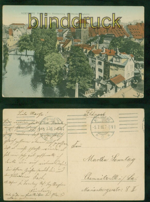 Bayern Nürnberg farb-AK Partie beim Henkersteg mit Henkerstegturm 1916 nach Chemnitz Karte gelaufen als Feldpostkarte aus Nürnberg 5.7.1916 nach Chemnitz Erhaltung siehe Scan