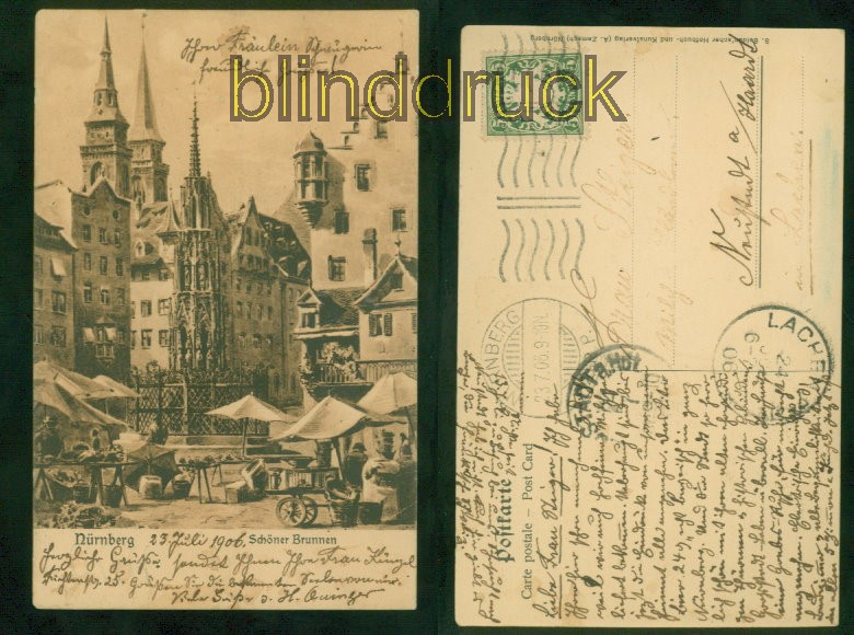 Bayern Nürnberg sw-AK Schöner Brunnen 1906 nach Neustadt Bickerdike-Stempel Karte gelaufen aus Nürnberg 23.07.1906 nach Neustadt / Haardt Marke entwertet mit Bickerdike-Stempel Erhaltung siehe Scan