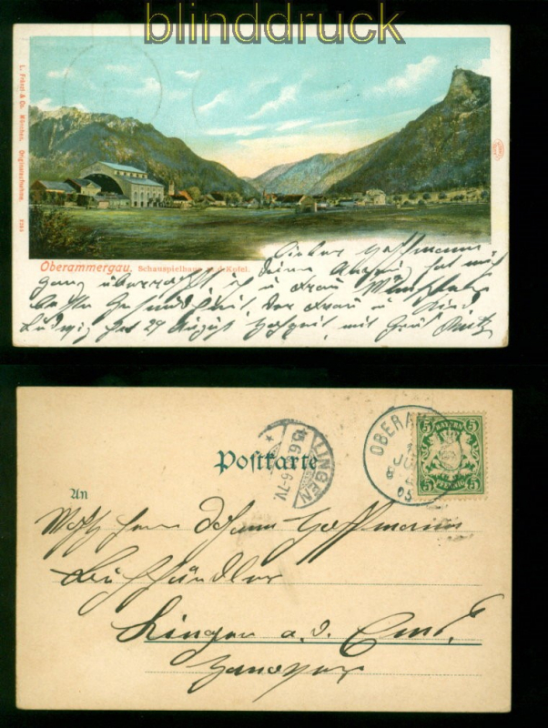 Bayern Oberammergau farb-AK Schauspielhaus m. d. Kofel 1905 nach Lingen Karte gelaufen aus Oberammergau 13.7.1905 nach Lingen Ankunftsstempel Erhaltung siehe Scan