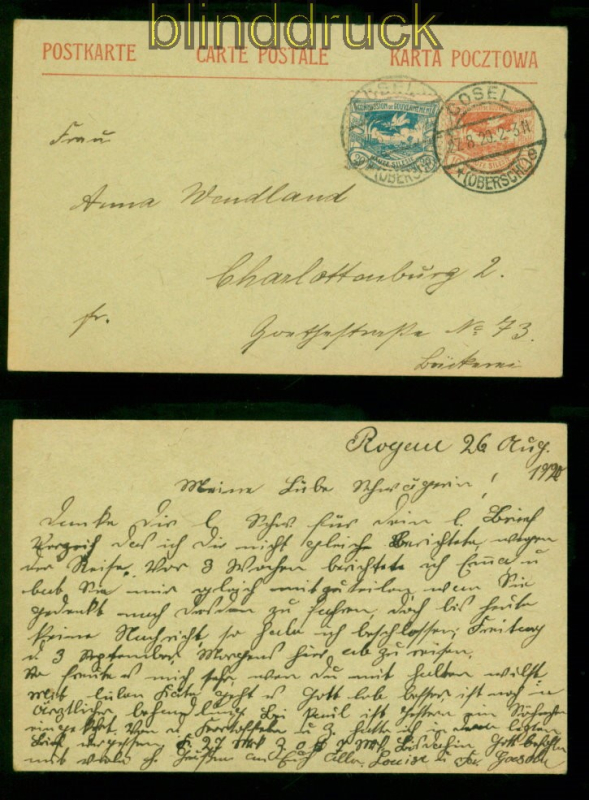 Abstimmungsgebiete Oberschlesien GSK P 3 mit # 18 MiF Cosel 27.8.1920 nach Charlottenburg 10 Pfennig Ganzsachenkarte in Mischfrankatur mit Mi # 18 gelaufen aus Cosel 27.8.1920 nach Charlottenburg Ortsstempelnummer laut Handbuch: 53.5 Erhaltung siehe Scan